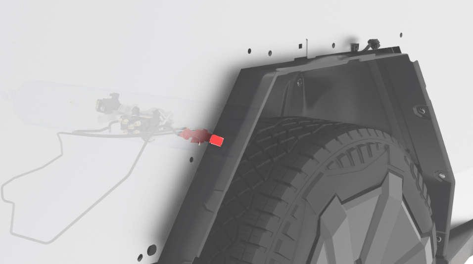 There is an air line behind the rear right wheel liner used by service to fill the air reservoir with nitrogen. The fitting on the air fill line is an "R1234yf" high side type.