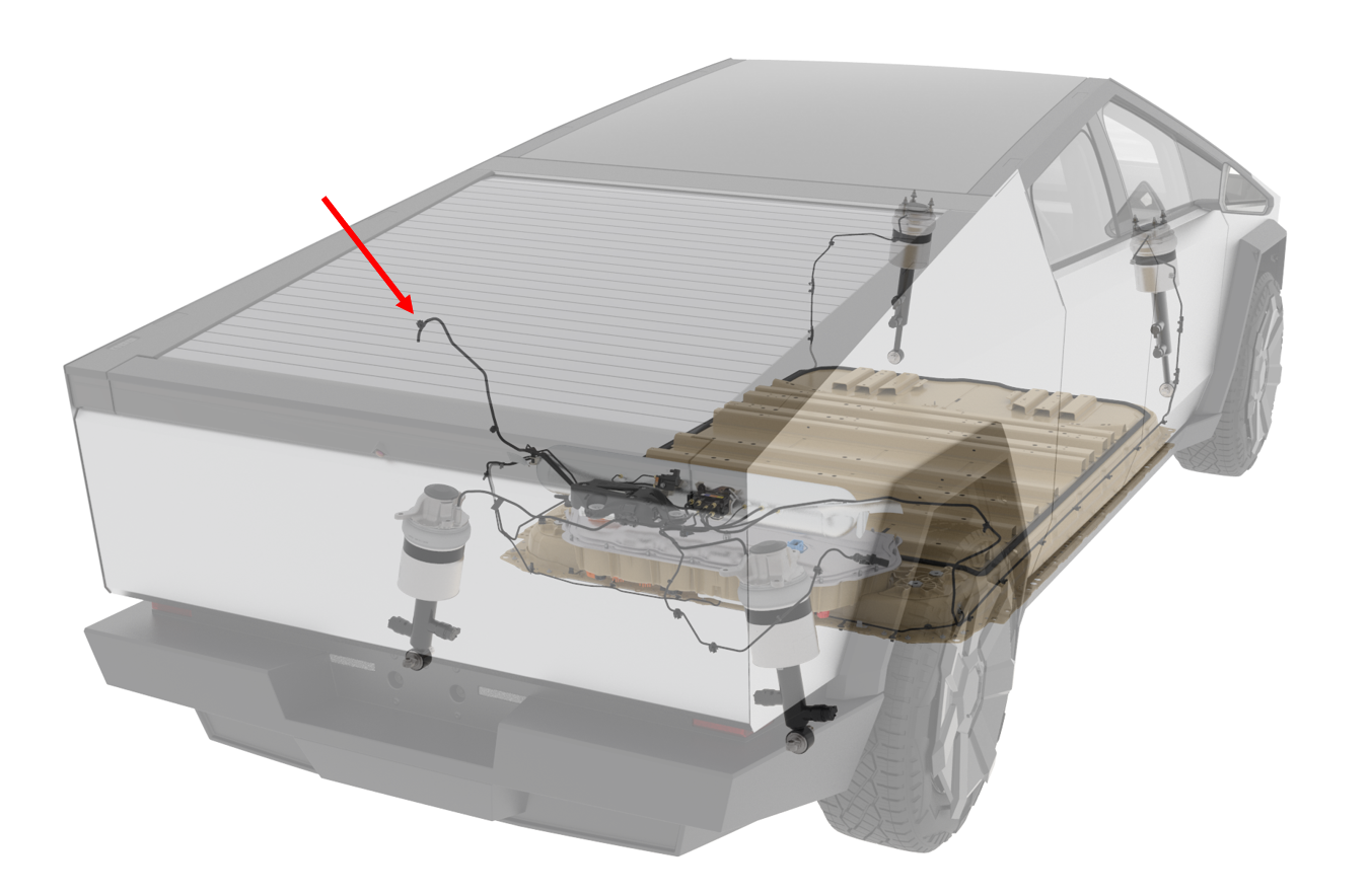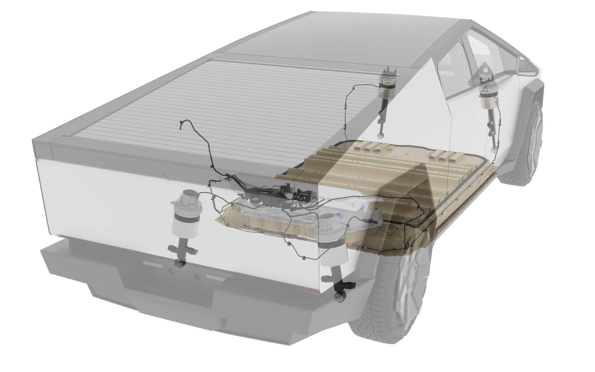 There are two valve blocks on Cybertruck, the Air Suspension valve block and the Pressurized Pack valve block. Both valve blocks are mounted on the reservoir tank, located under the bed access panel. The Air Suspension valve block is optimized for rapid axle leveling with consistent air flow through the valves. The Pressurized Pack valve block provides a method of active water ingress protection when the vehicle wades through water.