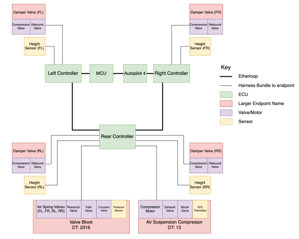 The TAS controller has been incorporated into VCREAR. VCLEFT and VCRIGHT are used to power the front height sensors and control the adaptive damping solenoid valves, and communicate sensor measurements to VCREAR over etherloop. VCREAR powers and communicates with the TAS valve block, Pressurized Pack valve block, air compressor, height sensors, and damper valves.