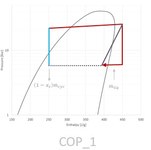 In COP 1 Mode, the system quickly heats up refrigerant, transferring the electrical power consumed by the compressor to the cabin. When the system is running in COP 1 mode, the compressor is running at high compressor speeds at start up. This requires the EXV.recirc to actuate in such a way (along with the other valves) to regulate the suction and discharge pressures. When there is enough heat in the system, it changes over to COP Blend mode.