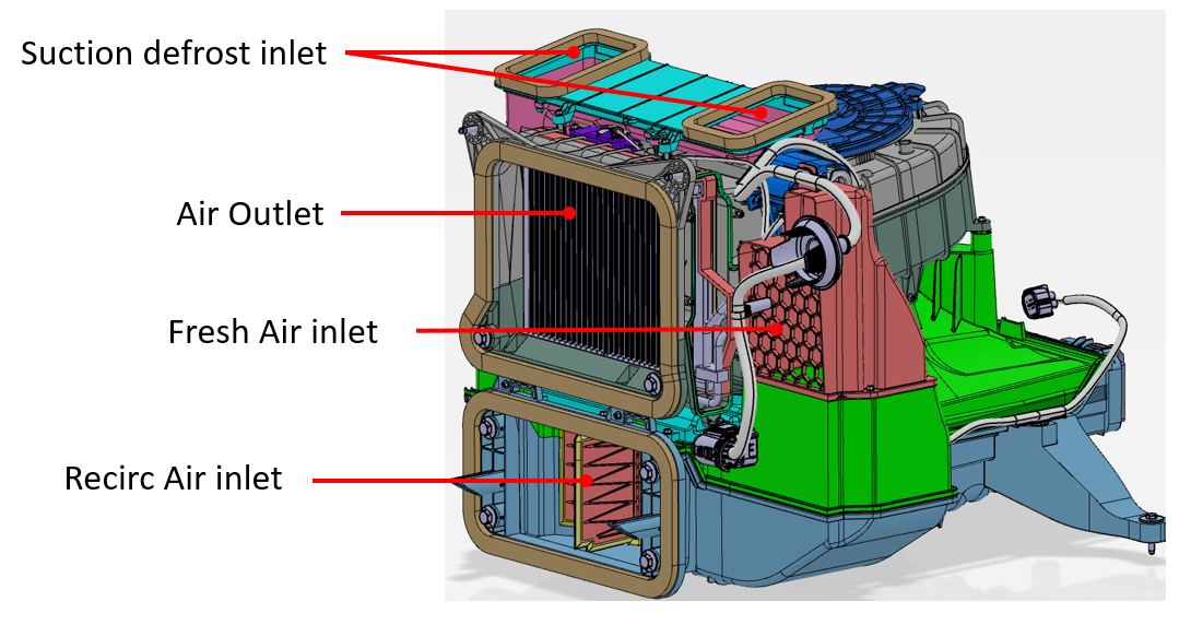 In Fresh Air mode, outside air enters in the underhood frunk area and is pulled into a HEPA filter. In Recirc Air mode, the cabin air enters the HVAC case and is pulled through the same HEPA filter. The Inlet Actuator controls the position of the Fresh/Recirculated air door allowing full Fresh, full Recirculation, or a blend of both Fresh and Recirculated air into the HVAC case.