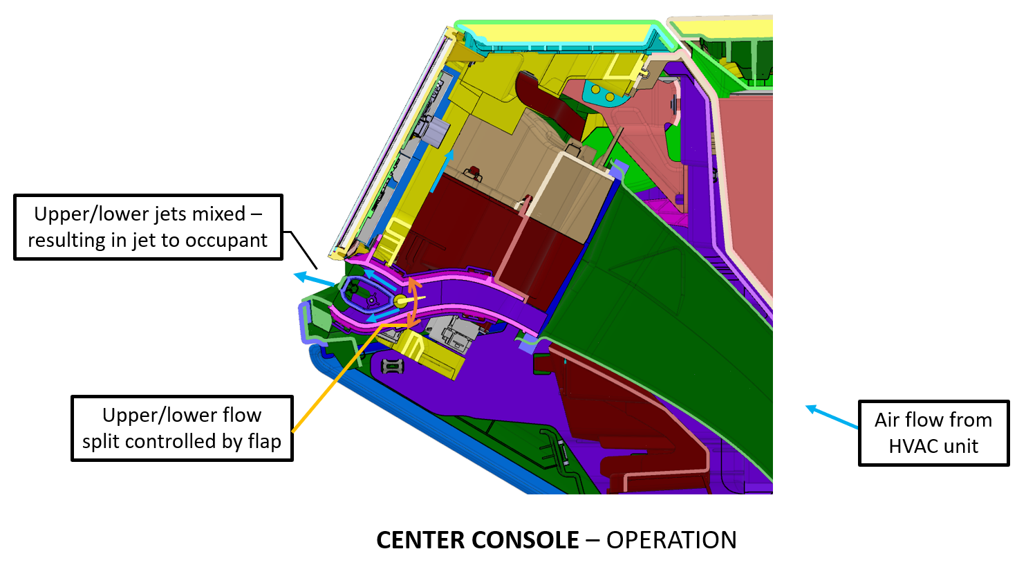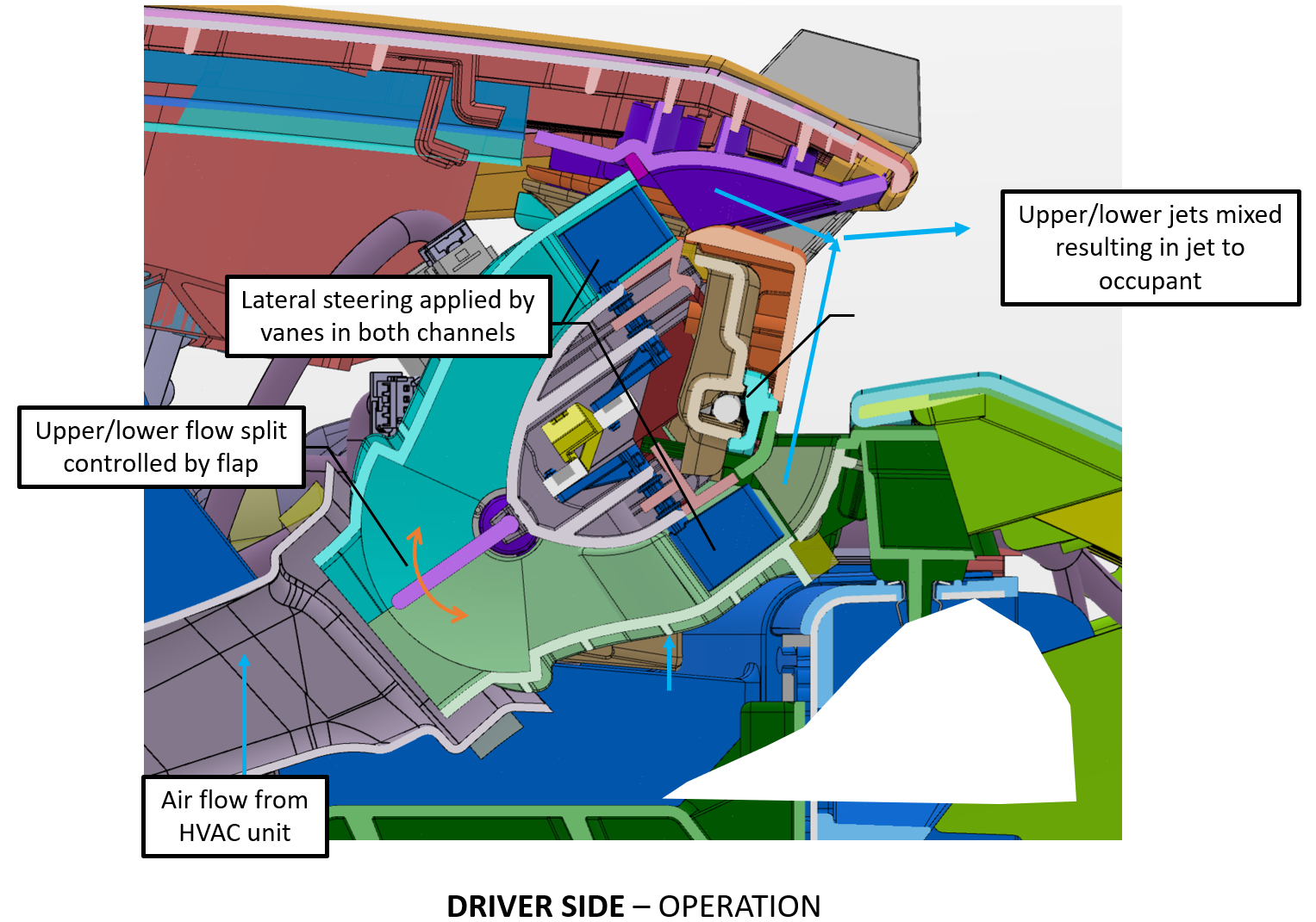 On Cybertruck, the cabin airwaves function similar to other Tesla vehicles. The conditioned air exits the HVAC case through the right and left panel ducts. The upper and lower air flow split is controlled by a flap located in the duct. The flap is controlled by the flap actuator. The upper and lower air jets then mix creating a single air jet to the occupant. Vertical adjustment of the air jet is accomplished by moving the flap in the duct either up or down. Flap up position moves the air jet up while flap down position moves the air jet down.