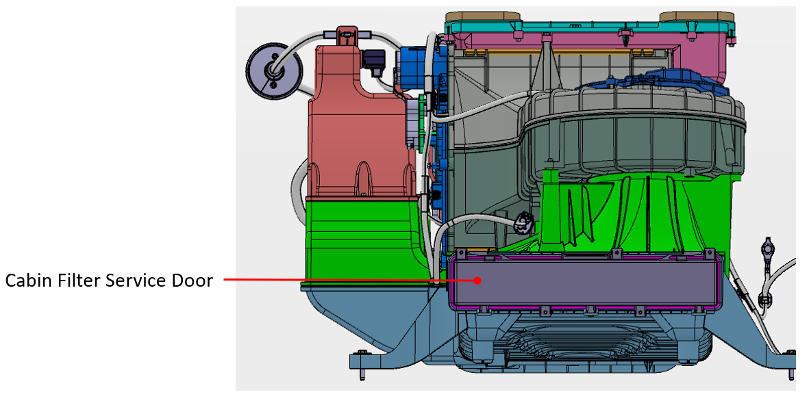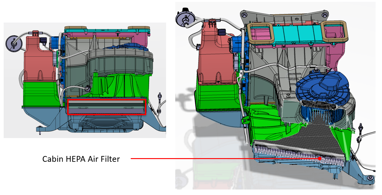 In Fresh Air mode, outside air enters in the underhood frunk area and is pulled into a HEPA filter. In Recirc Air mode, the cabin air enters the HVAC case and is pulled through the same HEPA filter. The Fresh air actuator, Recirc air actuator, and Suction Defrost actuator work together to control the amount of full Fresh, full Recirculation, or a blend of both Fresh and Recirculated air into the HVAC case.