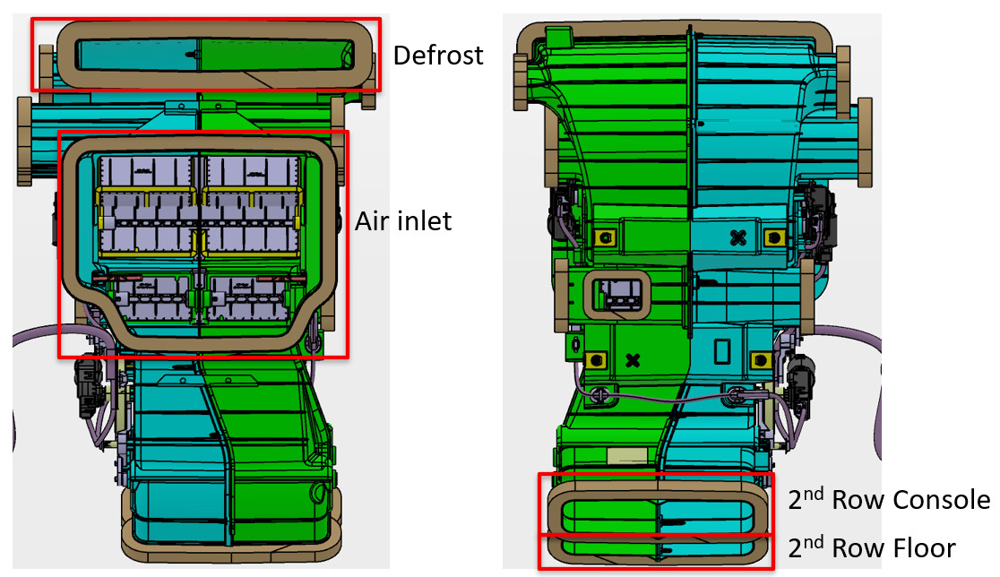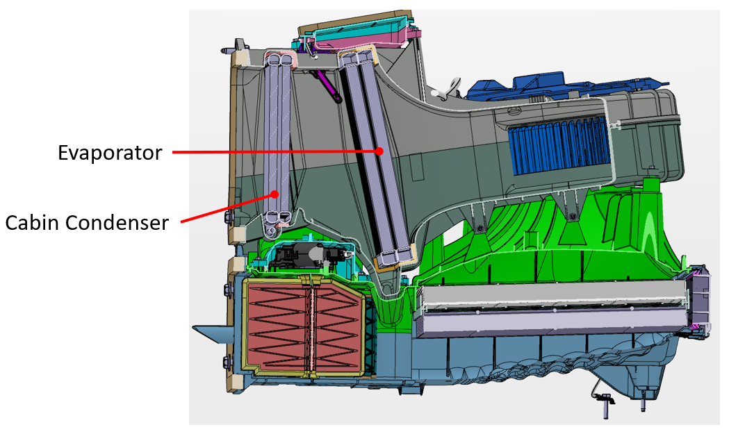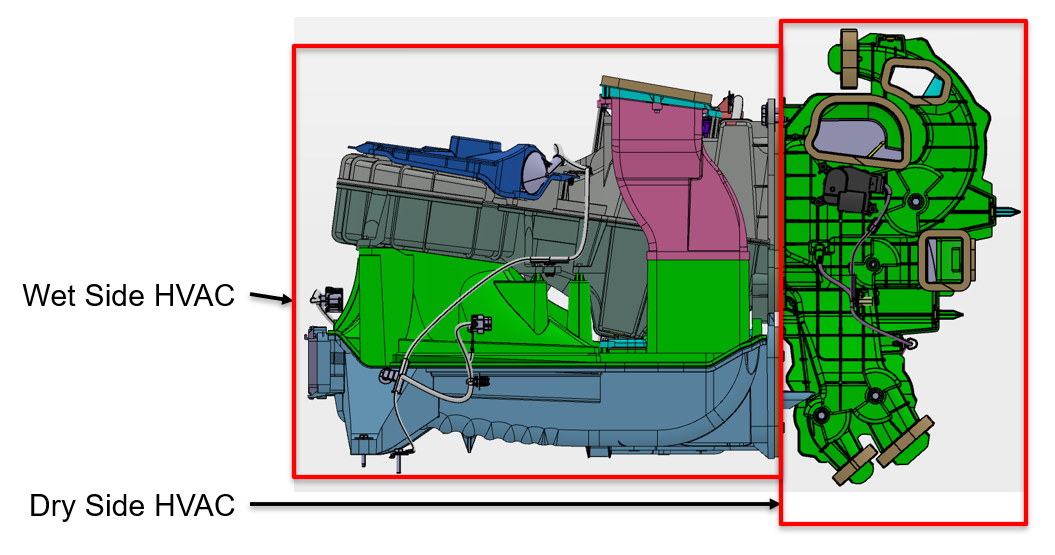 The HVAC case for Cybertruck is unique in that one part of the case is located under the instrument panel (dry side) and the other part of the case is located under the frunk hood (wet side). The components on the wet side versus the dry side of the HVAC case are shown in the image below:
