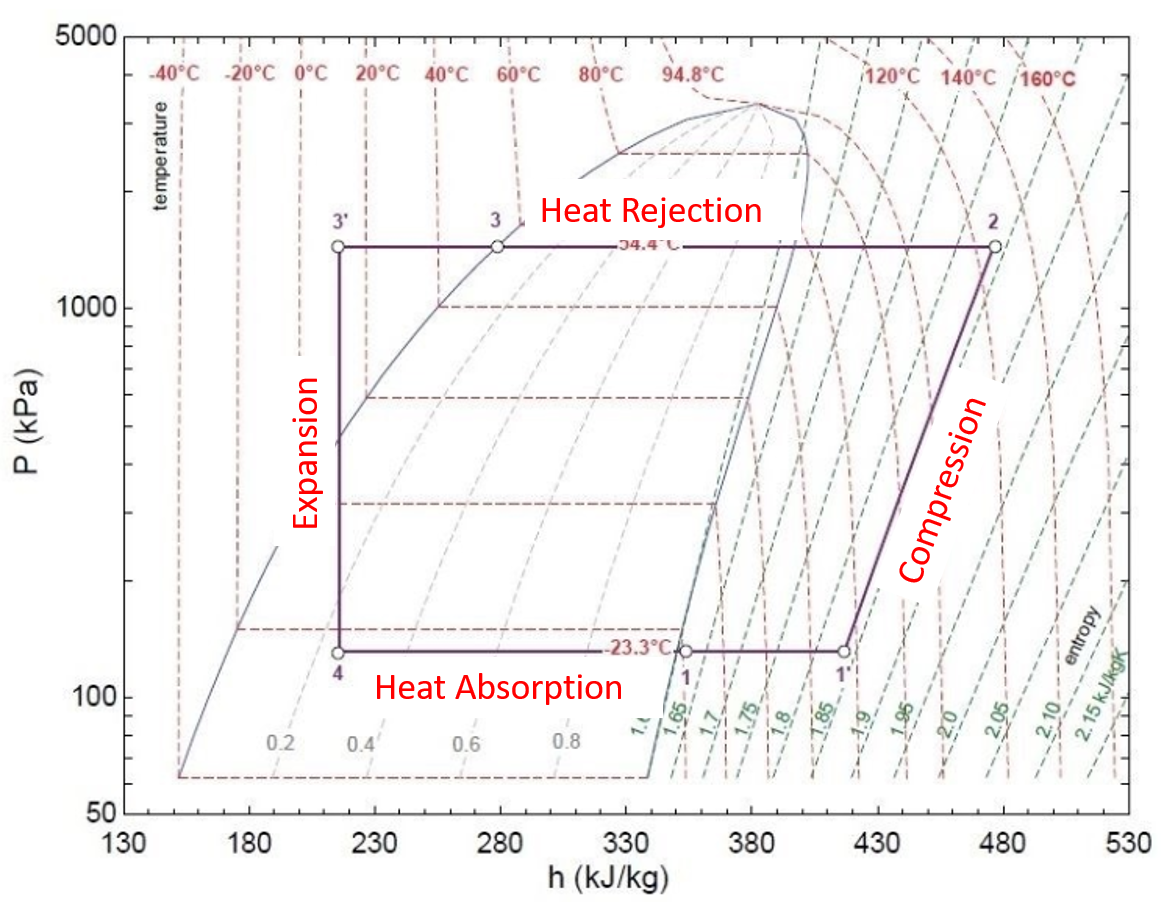 - From this point going to the left of the diagram, the refrigerant condenses to 100% liquid until point 3 has been reached.