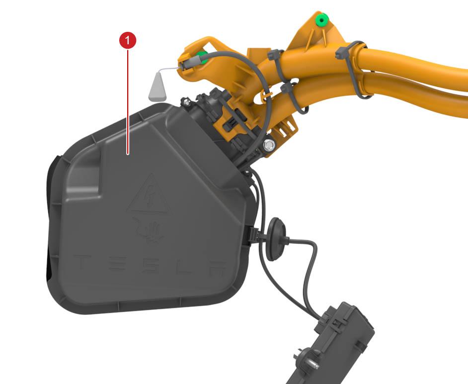 Two non-serviceable low voltage (LV) harnesses connect the charge port ECU to the charge port. The harnesses are covered by the closeout panel. High Voltage (HV) is not exposed below the closeout panel in Model 3 vehicles with cable conductor charge port architecture. High voltage is inside the inlet assembly, and should never be accessed during repairs.