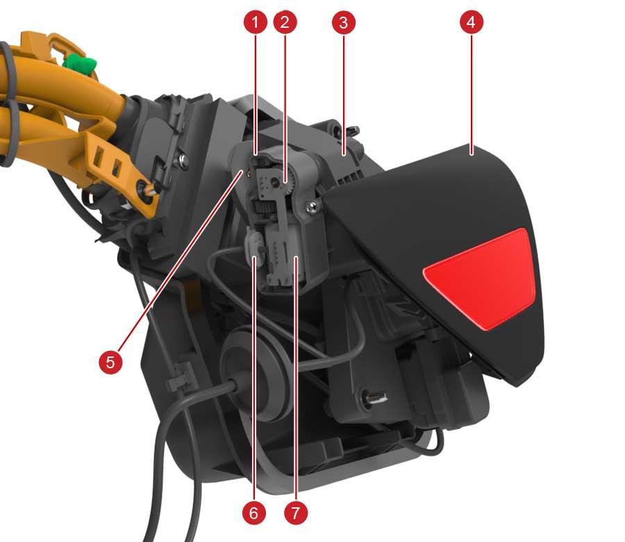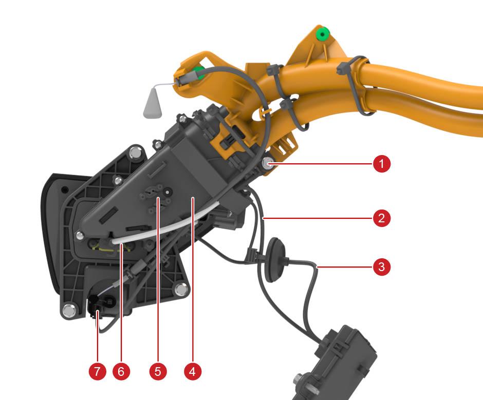 | 1. Door motor enclosure 2. Potentiometer 3. Charge port trim 4. Door 5. Hinge 6. 5 wire door drive and sense harness 7. Door motor |