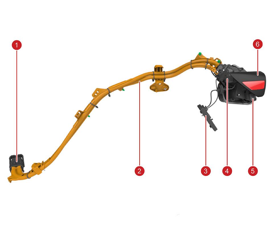 | 1. Chassis ground terminal 2. Inlet and latch LV harness 3. Door and trim LV harness 4. HV harness including inlet 5. Thermistor connectors 6. Inlet signal wire connector (pilot, proximity, ground) 7. 3 pin latch connector |