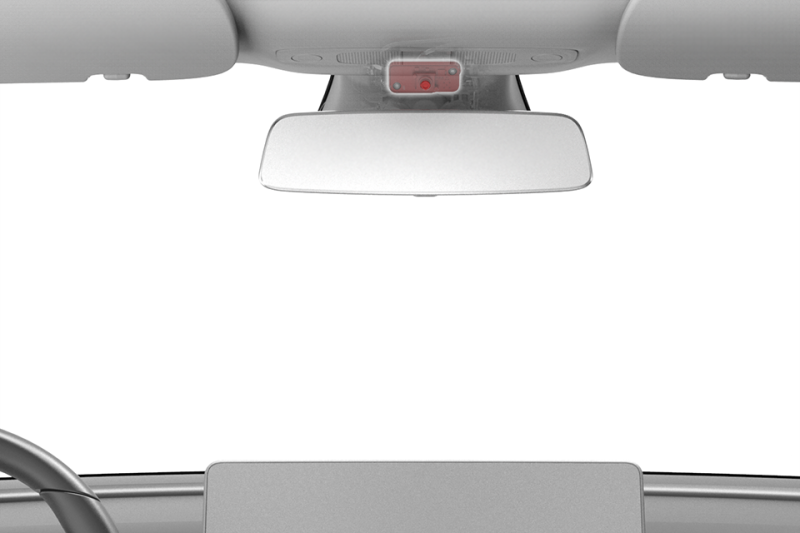 The Cabin camera is situated above the rear view mirror with an overview of the cabin. Power to the camera, control of the camera, and image data from it are provided through the coaxial wiring connected to the Driver Assistance ECU. Cabin camera is being used for driver monitoring only on certain vehicle configurations and regions. If the system detects that the driver is inattentive, they are alerted with an audible chime and a visual warning is displayed on the screen reminding them to place hands on the steering wheel.