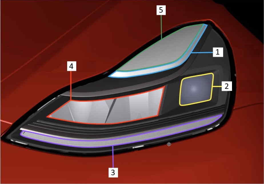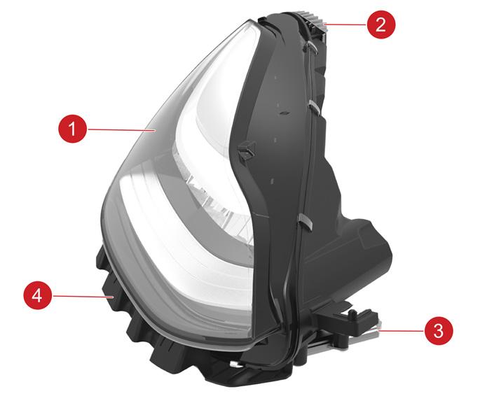 | 1. Park / Signature Light Guide (DRL Channel1) 2. Low Beam and High Beam Pixel Matrix (SSL100) 3. Turn indicator 4. Low Beam Pre-Field Reflector 5. Park / Signature Light (DRL Channel 2+3) |