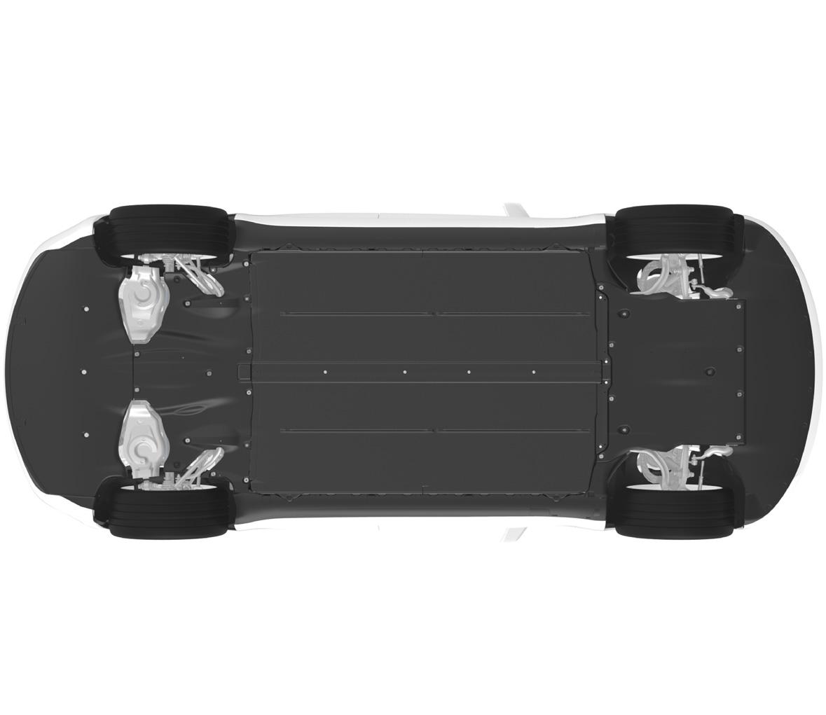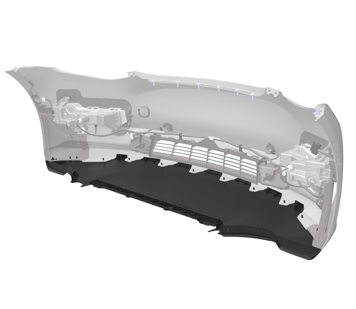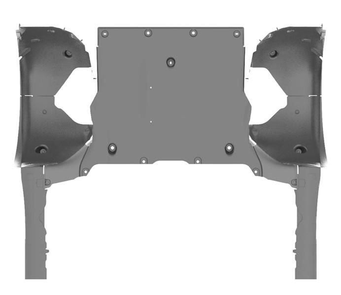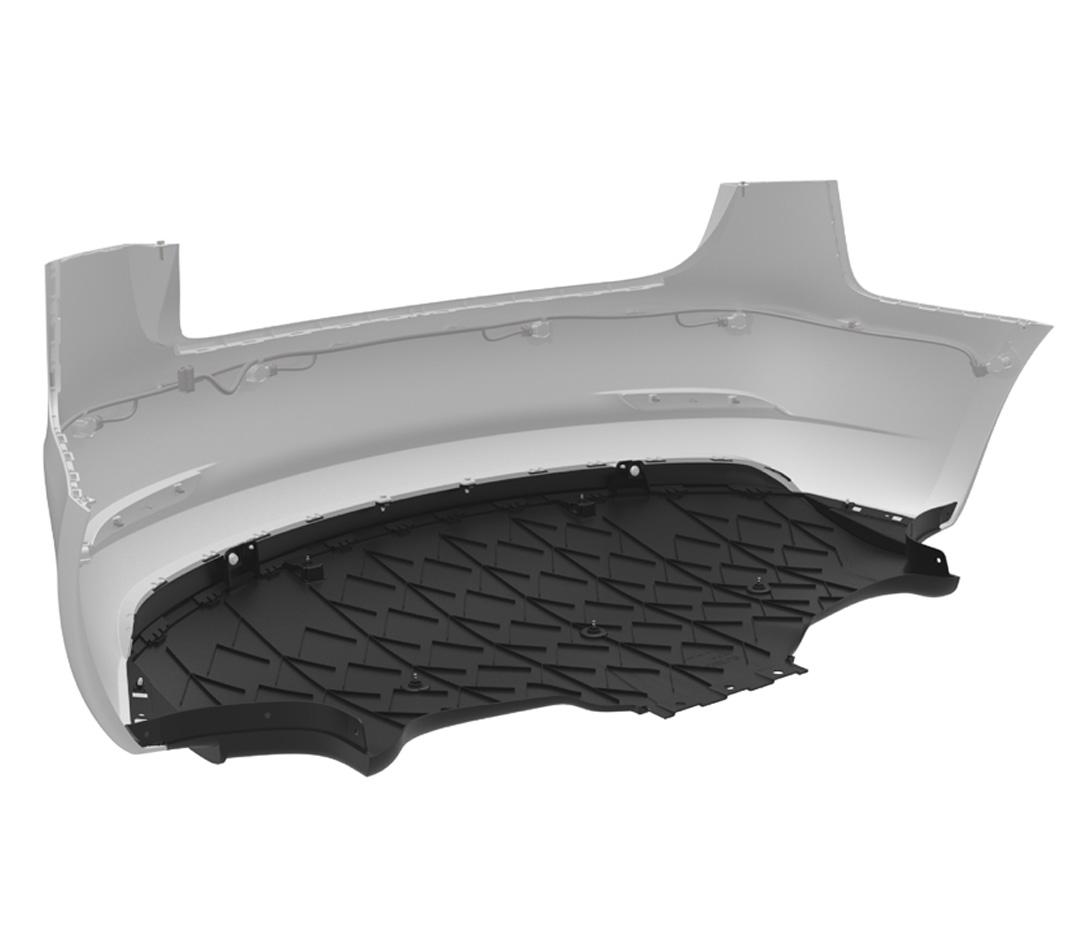 To reduce drag, the design of the Model 3 underbody uses molded plastic paneling that prevents air turbulence. Front to rear, the system begins at the front bumper fascia. Air for cooling and ventilation flows through the grill, which has active shutters to manage mass flow. Air then flows beneath the lower valence, which is attached to the front bumper fascia with a push-pull plastic rivet clips. The front aero shield covers the front subframe and the front valence. The rear aero shield covers the rear subframe and HV Battery, while overlapping with the wheel arch liners. The mid aero shield is located between the HV Battery and the rear diffuser. The rear suspension covers attach to the control arms of the rear suspension. The rear diffuser is the last piece of the underbody aero system. It attaches to the mid aero shield, the trunk load floor, and the rear lower bumper fascia. It cannot be removed from Model 3 without first removing the rear bumper fascia due to the use of buckle snaps.