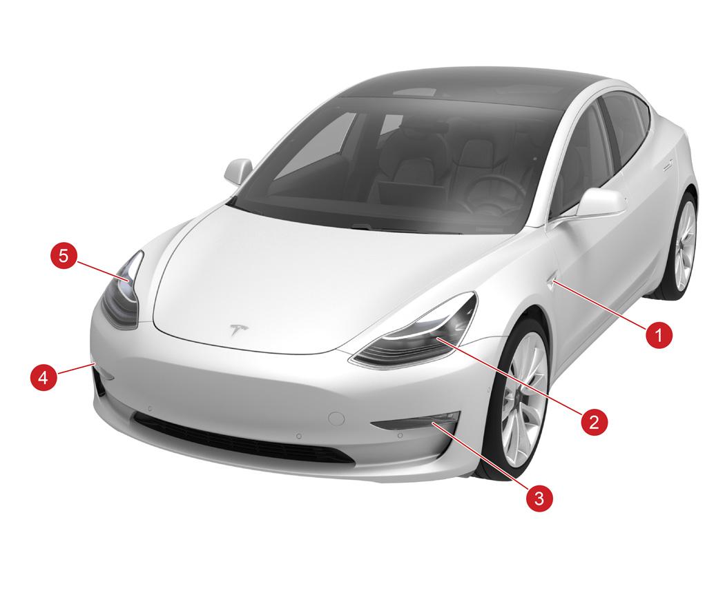| 1. Side repeater camera assembly (left-hand) 2. Headlamp assembly (right-hand) 3. Fascia light assembly (left-hand) 4. Fascia light assembly (right-hand) 5. Headlamp assembly (left-hand) |