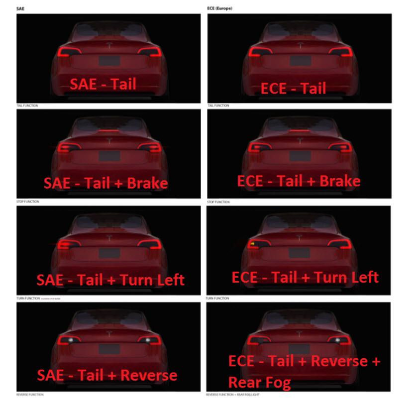 In late 2020, Global Headlamp was introduced for front and rear lights. Before that, regional lighting variants existed (SAE and ECE) to comply with market-specific regulations, with single country exceptions in lighting behaviors in Canada (SAE) and Iceland (ECE). SAE and ECE variants have different part numbers, while regional exceptions are administered via firmware. With Global Headlamp, regional differences can be recognized by software and the same hardware is used worldwide. Operation of the exterior lights is controlled by the three main vehicle controllers (Front, Left, Right). As with other low voltage components in Model 3, the exterior lights utilize electronic fuses incorporated into the vehicle controllers. The exterior lights respond to requests from: