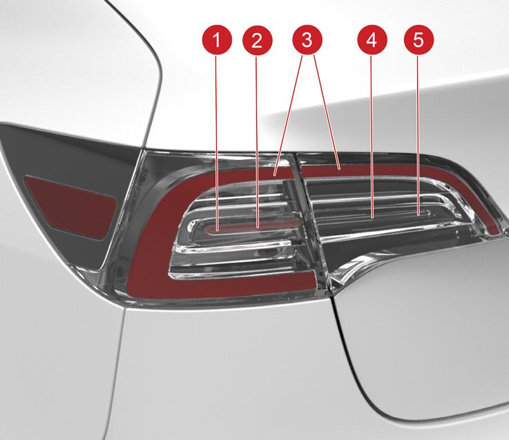 Model 3 has the same style tail lights as the Model S and Model X, with lights on the body and liftgate. The charge port is hidden in the left-hand body light assembly. The brake lights and turn signals use the same LEDs as the tail lights, but the brightness is increased. The change in brightness is controlled by an LED Driver Module (LDM) mounted inside each light. This module changes the Pulse Width Modulation (PWM) signal to the LEDs to increase the brightness. The tail light assembly must be replaced as an assembly. Individual components are not serviceable.