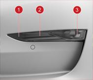 | 1. Side marker - SAE markets only 2. Auxiliary Park (fog light guide for ECE markets) 3. Fog light (fog lens ECE) |