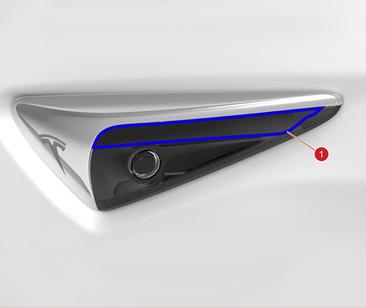 The Model 3 side repeaters have an integrated camera for Autopilot functions. The LED indicator runs in the direction of travel above the camera, highlighted in the figure below. The side repeater assembly must be replaced as an assembly. Individual components (LED, Camera) are not serviceable.