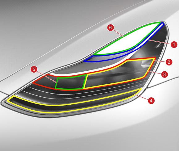 | 1. Park / Signature Light Guide 2. Premium Low Beam (Red) 3. Base Low Beam (Yellow) 4. Turn Indicator 5. High Beam 6. Park / Signature Diffuse |