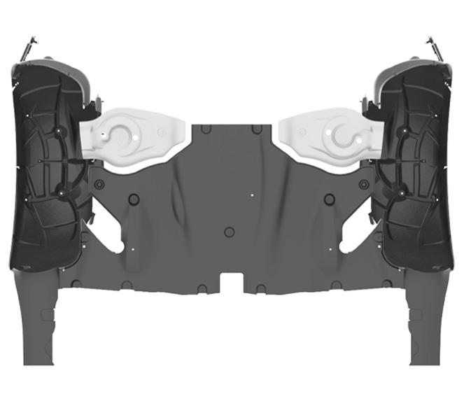 There are four wheel liners in Model 3. These help protect the vehicle against damage from rocks, dirt, salt, road debris, and weather elements. Wheel liners are snapped into place using push-pull rivets which attach the wheel liners to the body-in-white, front and rear fascias, front and mid aero shields, and base rocker covers. Removal of any one wheel liner requires the removal of more than ten push-pull rivets.