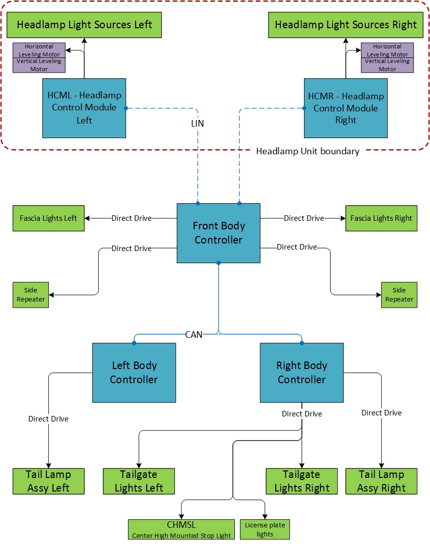 The exterior lighting system control is distributed between the vehicle controllers as depicted in the diagram below. The front headlights have their own ECU, the Headlamp Control Module (HCM), which is powering the individual LEDs inside the headlamp. The rear lights consist of the body and liftgate tail and stop lights as well as the license plate lights. They are managed by the left and right body controllers.