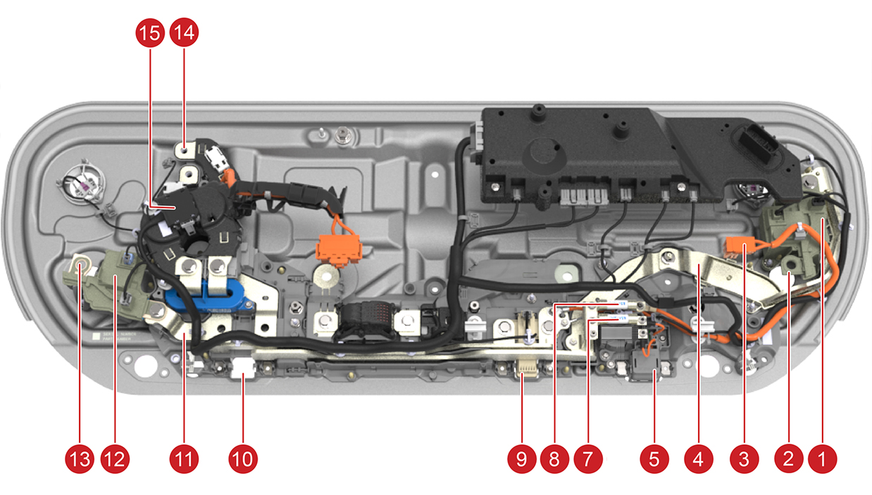 | 1. Positive pack-contactor 2. Pack-contactor ring for HV battery positive 3. DC link HV PCS connector 4. Positive DC link busbar 5. HV connector for compressor 7. HV thermal Fuse on HV A/C compressor positive link 8. HV thermal fuse on PCS DC positive link 9. HV connector to rear drive unit 10. HV connector to front drive unit 11. Negative DC link bus bar 12. Negative contactor 13. Contactor terminal that connects to HV battery minus 14. Terminal to bus bar charge port ancillary bay connector 15. Fast charge contactors |