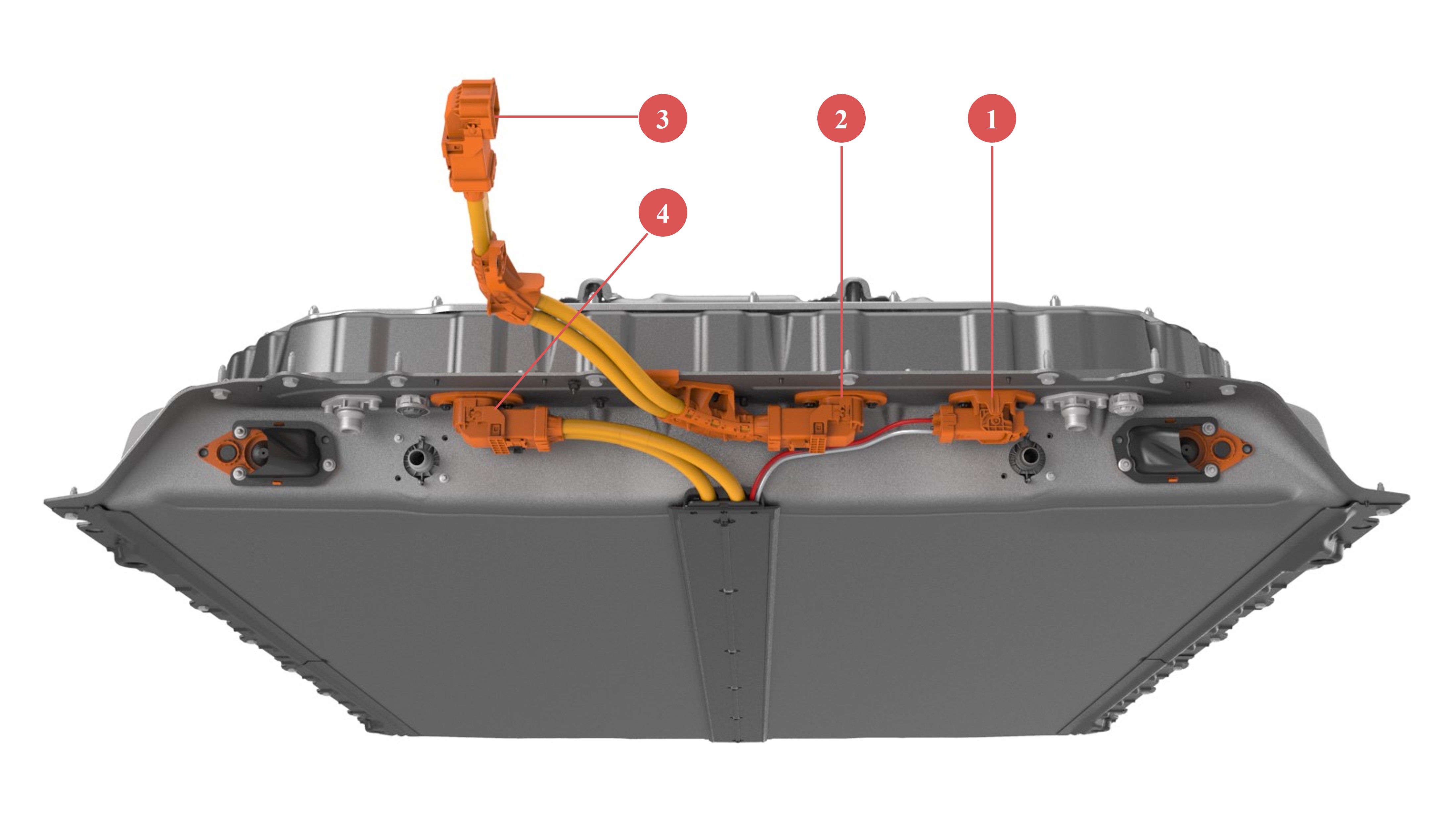 | 1. Rear side HVAC harness connector to battery 2. Rear side front drive unit harness connector to battery 3. HV connector to HVAC 4. HV connector to front drive unit |