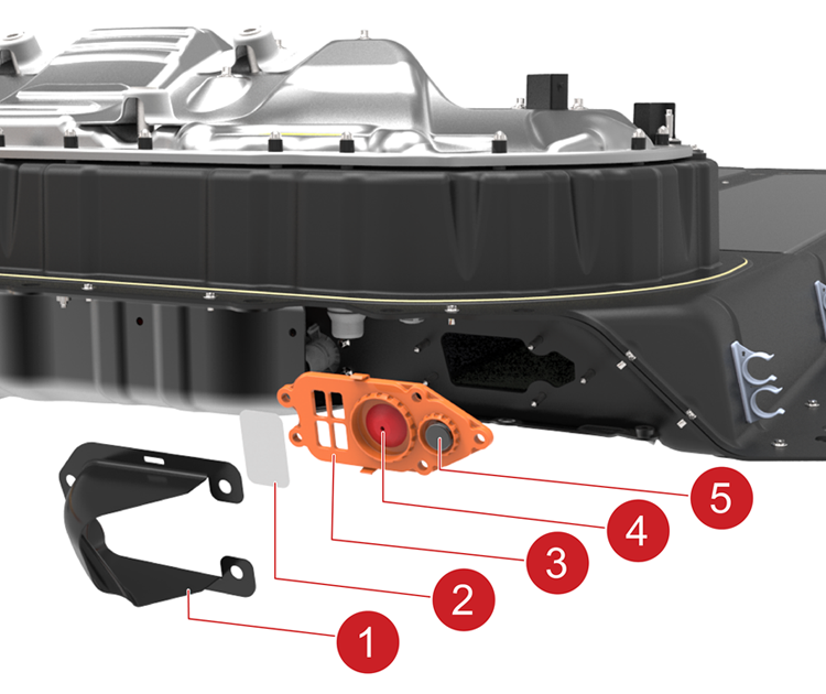 - Coolant passthrough to connect external coolant lines to the ones going to the PCS inside the HV battery.
