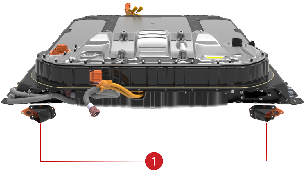 | 1. Coolant outlet out of the ancillary bay 2. Coolant inlet into the ancillary bay 3. Coolant inlet into the HV battery for the ancillary bay |