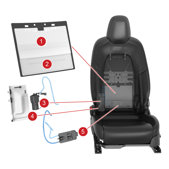 The Model 3 seat lumbar system is a pneumatic 2-bladder, 4-way power system. It consists of an air pump, a valve pack, two air bladders and a lumbar flex mat. The lumbar control unit is controlled via LIN communication by the corresponding left or right body controller. Depending on the user command via the 4-way lumbar control button on the seat, the control unit will pump or deflate the corresponding air bladders to provide the desired lumbar support. The body controller consistently monitors the pressure in each bladder using the pressure sensors in the valve control unit to keep the pressure within specified limits. There is also a blow-off valve for each bladder to release excess air once max pressure is reached. The body controller monitors pressure change during operation to identify a possible leak in the system.