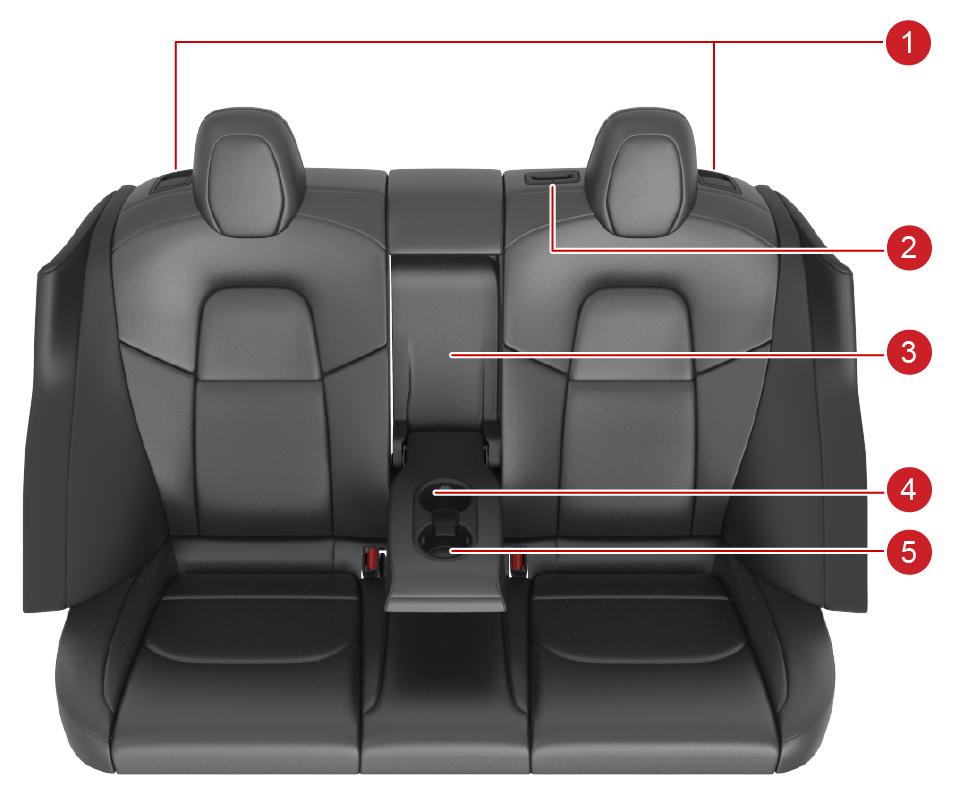 | 1. Fold flat bezel 2. Escutcheon bezel 3. Rear seat console closeout panel 4. Rear seat closeout cup holder liner 5. Rear seat closeout cup holder floor |