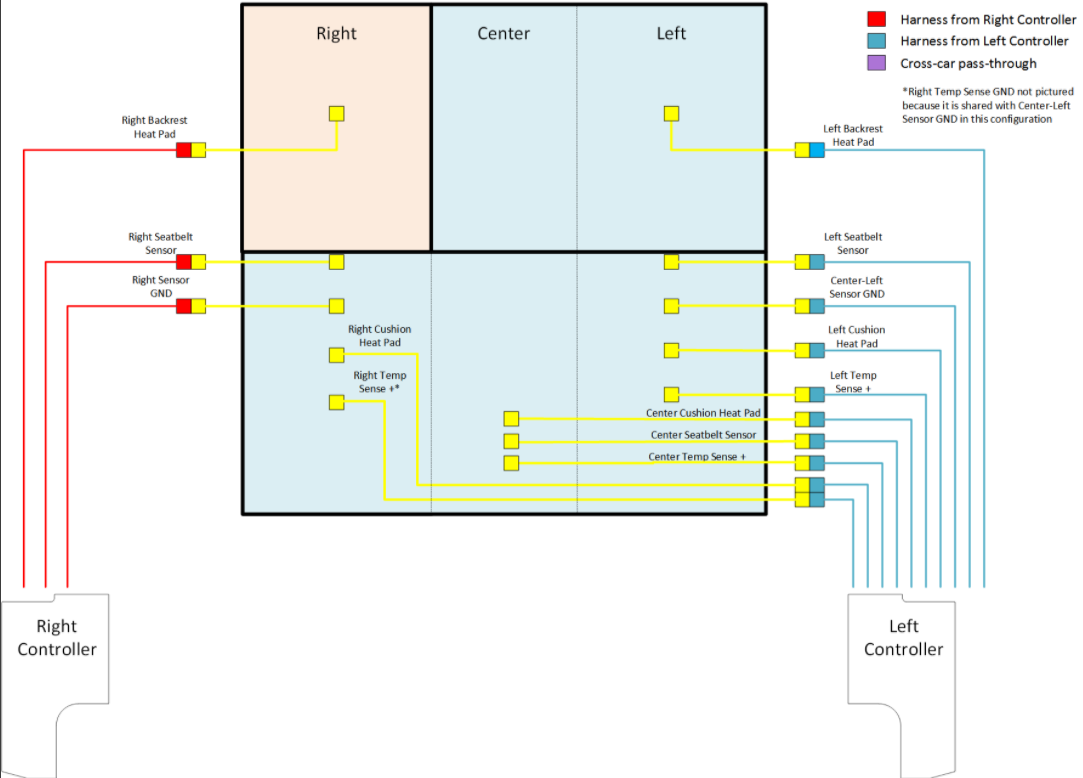 Vehicles built after November 3, 2020, the second row occupancy and seat heat communicate on VCLEFT. The heat pad on the seatback of the 40% seat communicates on VCRIGHT, while all other heating communicates VCLEFT. See below diagram for visual.