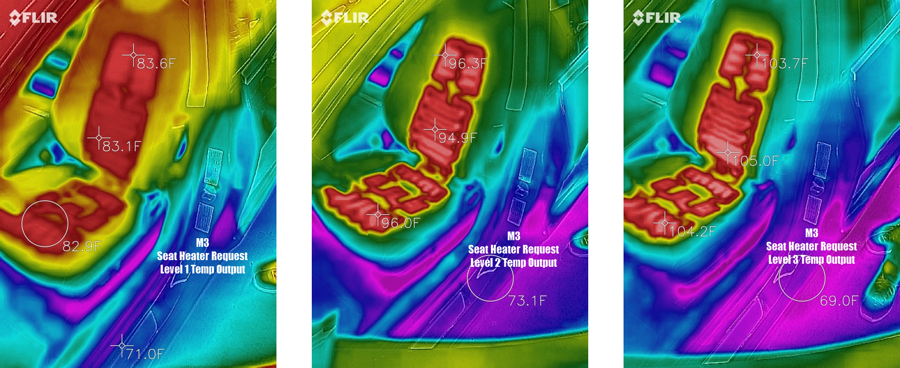 There are 3 heating temperature targets for the seats (low, medium, and high). Target temperatures for both the cushion and the backrest are: