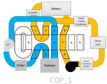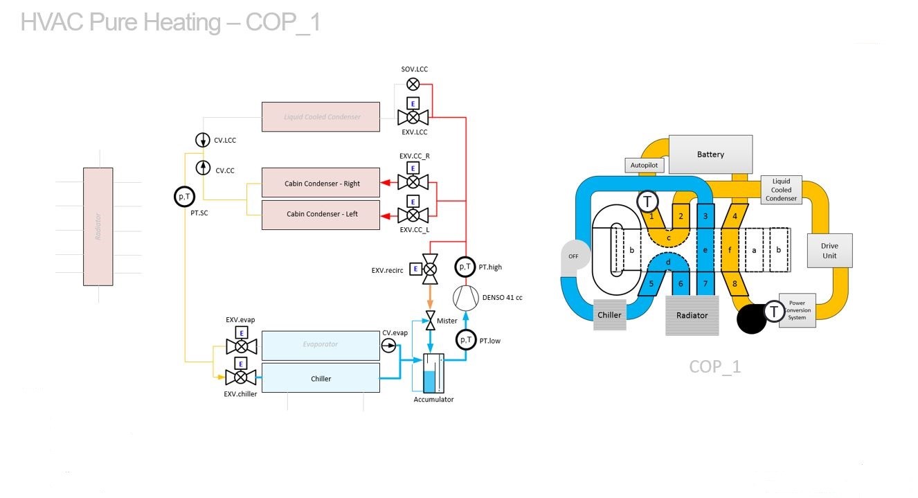 COP 1 mode turns OFF both chiller pumps, thus allowing no heat from ambient air via the radiator to be rejected to the chiller. Instead, the A/C compressor uses the internal mister loop to generate heat for cabin heating.