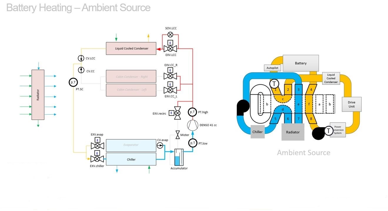 Ambient Source mode allows heat from ambient air via the radiator to be rejected to the chiller for heat pump cabin heating. This mode also connects the HV battery coolant loop to the powertrain coolant loop for HV battery heating.