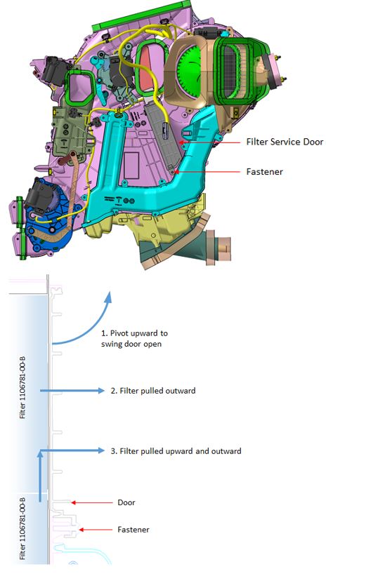 Model 3 has two tandem cabin air filters located in the HVAC case. The air filters are identical combination (gas / particle) media filters. Both air filters can be accessed by removing a cover on the right side of the HVAC case and using the pull tabs to slide the air filters out of the HVAC case. Filter B is removed first from the opening at the top of the HVAC case, followed by Filter A. Installation is reverse procedure making sure both pull tabs are folded down over Filter B making them accessible for future filter removal.