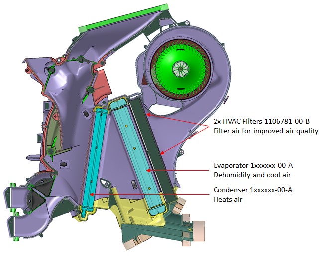 Air is drawn into the HVAC case by the integral blower motor located under the center of the instrument panel. The air is then forced into the HVAC unit through a two-piece cabin filter, then through the evaporator, followed by the condenser. When the air conditioning is required, the evaporator cools and dehumidifies the air. When heating is required, the condenser heats and dehumidifies the air.