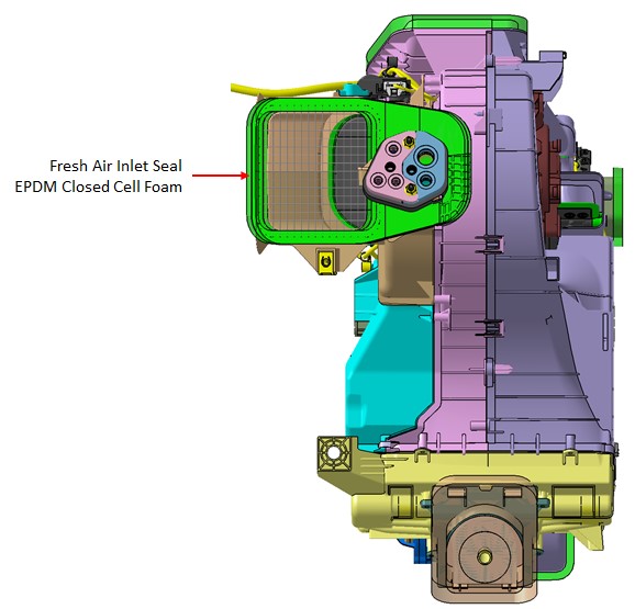 In Fresh Air mode, outside air enters through the openings at the base of the windshield on the right hand side of the vehicle. In Recirculation (Recirc) Air mode, the cabin air enters the HVAC case through the Recirc Inlet located above the glove box. The Inlet Actuator controls the position of the Fresh / Recirc air door allowing full Fresh, full Recirc, or a blend of both Fresh and Recirc air into the HVAC case.