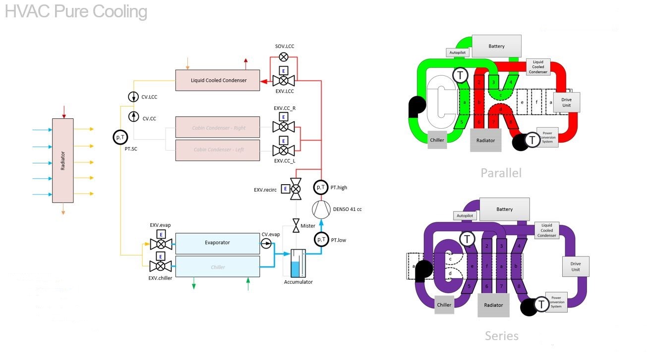 Parallel mode separates the HV battery and powertrain coolant loops. This mode allows separate heat rejection from HV battery and powertrain to the chiller and radiator respectively.
