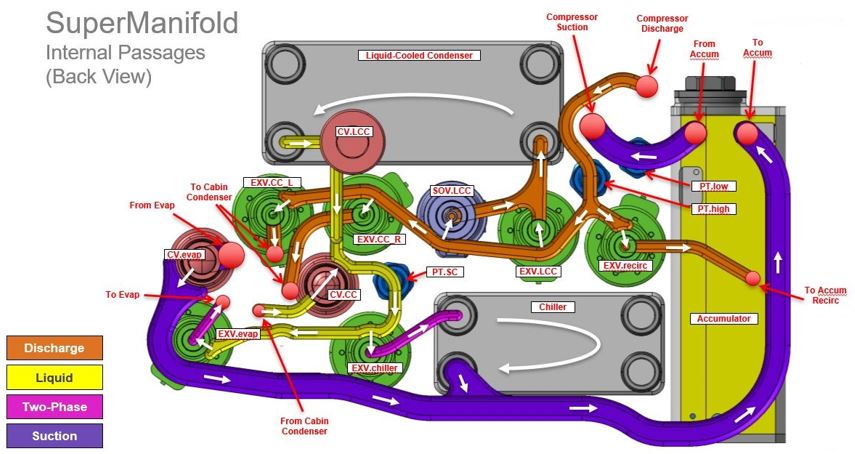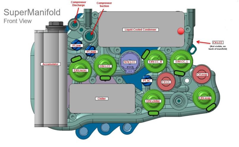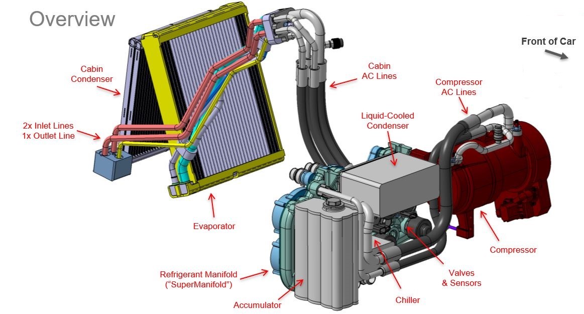 The following diagrams show the layout of the Tesla heat pump system and the related components. Each component is described in further detail.