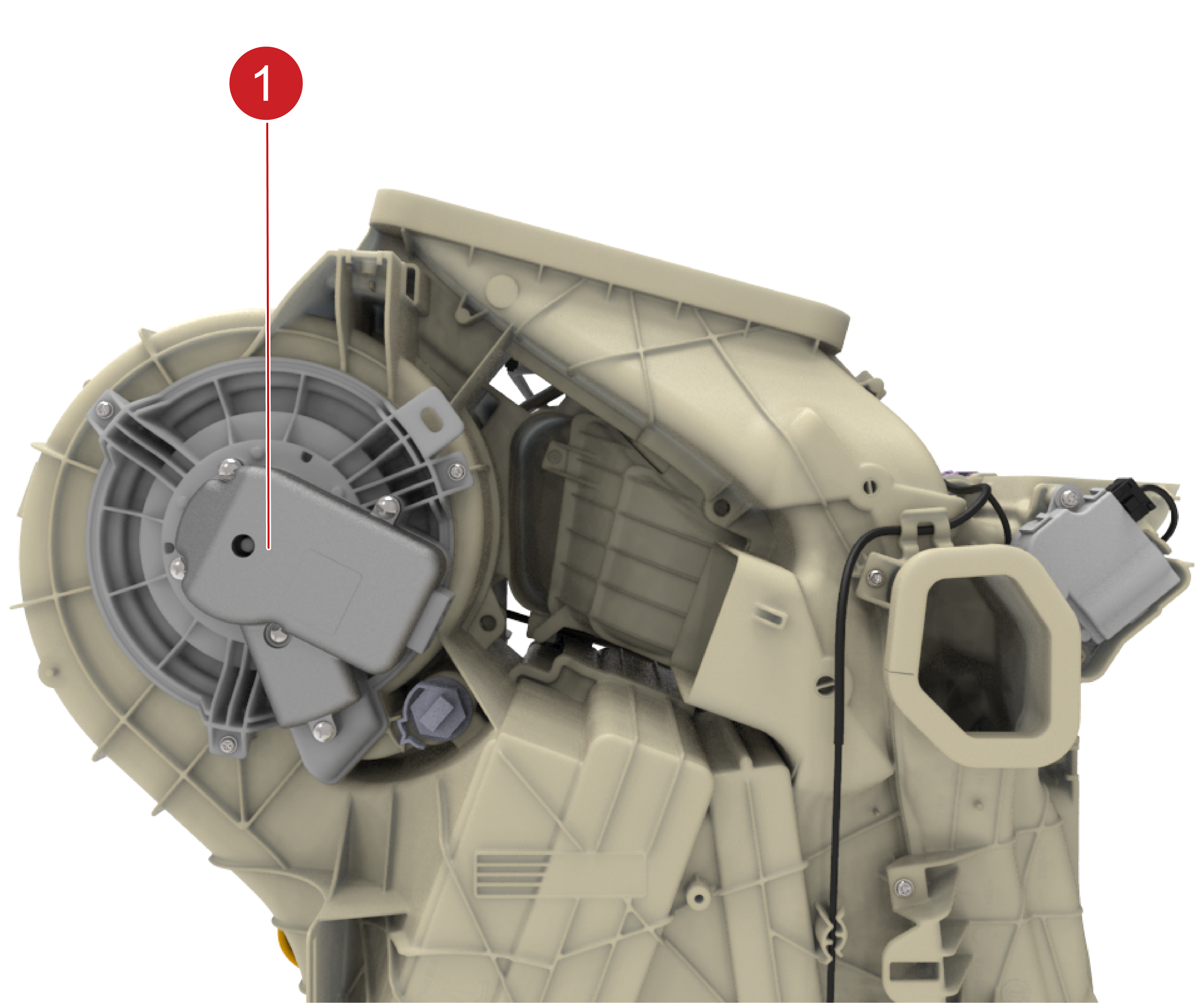 The HVAC case blower motor is a maintenance free, 3-phase BrushLess AC (BLAC) motor. The motor speed is controlled by the Vehicle Controller (VC) Left, which varies the AC voltage (12V battery) to each of the 3-phases in the motor. Maximum motor operating current is 34A and the motor bearings are lubricated for life. The motor is permanently attached to the fan scroll, creating a blower assembly, which is serviceable from the HVAC case.