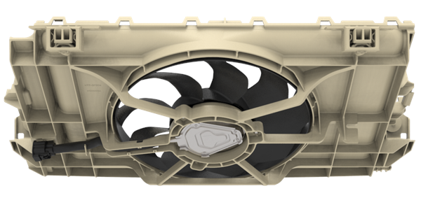 The Model 3 uses a single condenser fan assembly, made up of the fan motor, the fan, and the fan shroud. The fan motor is a maintenance-free, 3-phase BrushLess AC (BLAC) motor, and it's speed is controlled by the Vehicle Controller (VC) Front controller, which varies the AC voltage (12V battery) to each of the 3-phases in the motor.