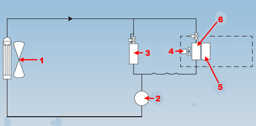 Aluminum and rubber refrigerant line assemblies connect system components. Seals between the connections ensure a secure seal. To maintain similar rate of flow through the system, the diameter of the refrigerant lines varies to suit the low pressure / low temperature and the high pressure / high temperature sections. Larger diameter lines are used on the low pressure / low temperature section and smaller diameter lines are used on the high pressure / high temperature section.