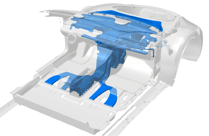 The conditioned air exits the HVAC case through the right / left Panel Ducts and right / left Bleed Ducts. The right and left Panel Ducts feed the Panel Duct Plenum, which is located in the instrument panel. The right and left Bleed Ducts feed the Bleed Duct Plenum, which is also located in the instrument panel. The Panel Duct Plenum provides airflow in the (X) direction, while the Bleed Duct Plenum provide airflow in the (Z) direction. Both the (X) and (Z) airflows meet outside the instrument panel to provide a combined panel airflow to the cabin.