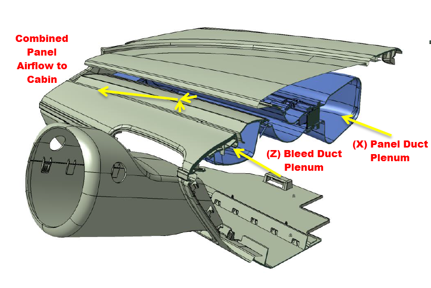 The airflow from the Panel Duct in the (X) direction is mostly constant, while the airflow from the Bleed Duct in the (Z) direction can be varied to provide a wide range of airflow that can be directed at the cabin occupants from their waist to their upper head.