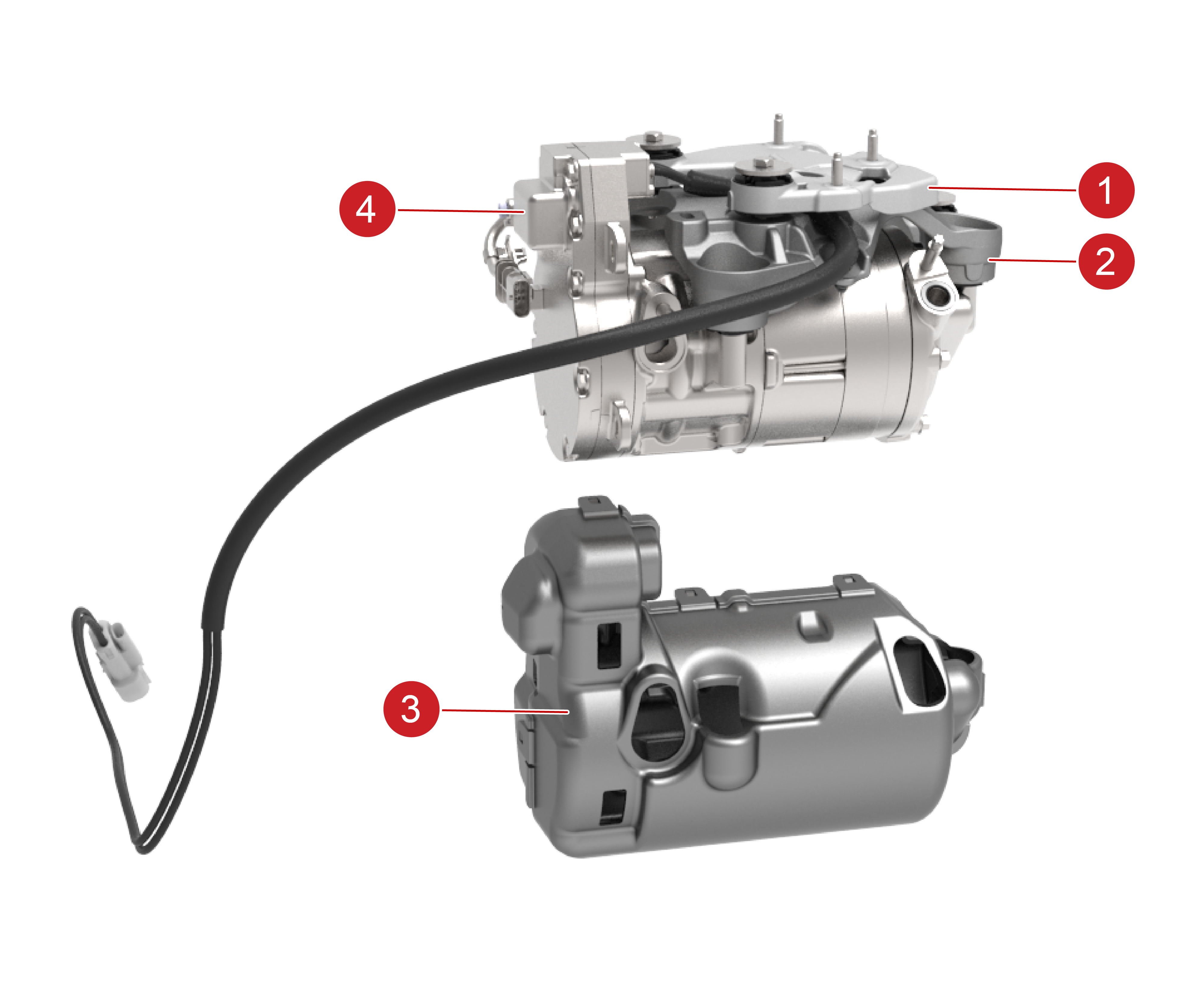 | 1. Upper Bracket 2. Lower Bracket 3. Compressor NVH Cover 4. Air Conditioning Compressor |