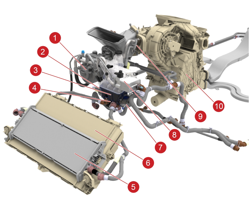 | 1. A/C compressor 2. Powertrain coolant pump 3. Coolant reservoir (superbottle) 4. 5-Way valve 5. Radiator 6. Condenser 7. Battery coolant pump 8. Coolant chiller / Electronic expansion valve (EXV) assembly 9. Thermal expansion valve (TXV) 10. HVAC case |