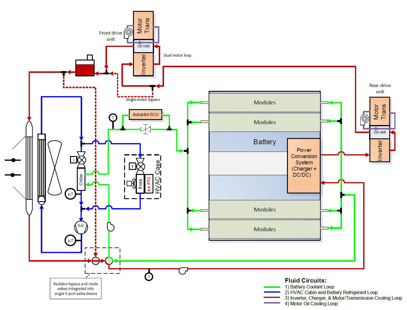The vehicle thermal system components include a radiator, coolant hoses, coolant pumps, and a 5-Way valve. The vehicle thermal system heats or cools the coolant that circulates through the HV Battery and powertrain loop components. The HV Battery loop consists of the HV Battery, chiller, and autopilot module. The powertrain loop consists of the Power Conversion System (PCS), drive unit(s), radiator, and coolant reservoir (superbottle).