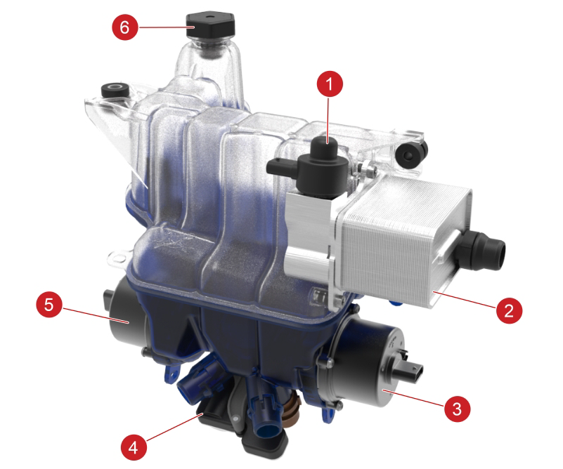 | 1. Chiller Expansion Valve (EXV) 2. Coolant chiller 3. Battery coolant pump 4. The 5-Way valve 5. Powertrain coolant pump 6. Coolant reservoir cap |