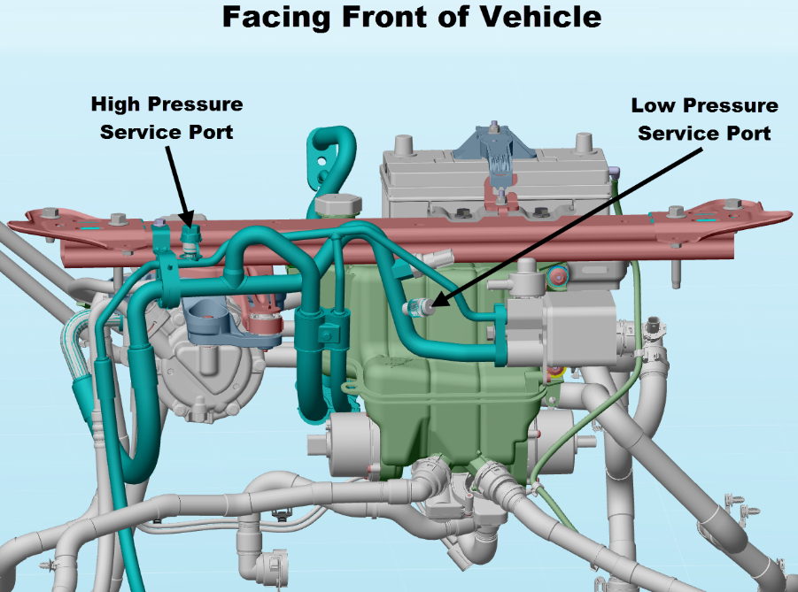 The high and low pressure refrigerant service ports are an integral part of the refrigerant lines, and are located under the hood. The high pressure service port is on the line between the condenser outlet and evaporator TXV inlet. The low pressure service port is on the line between the evaporator TXV outlet and the compressor inlet.