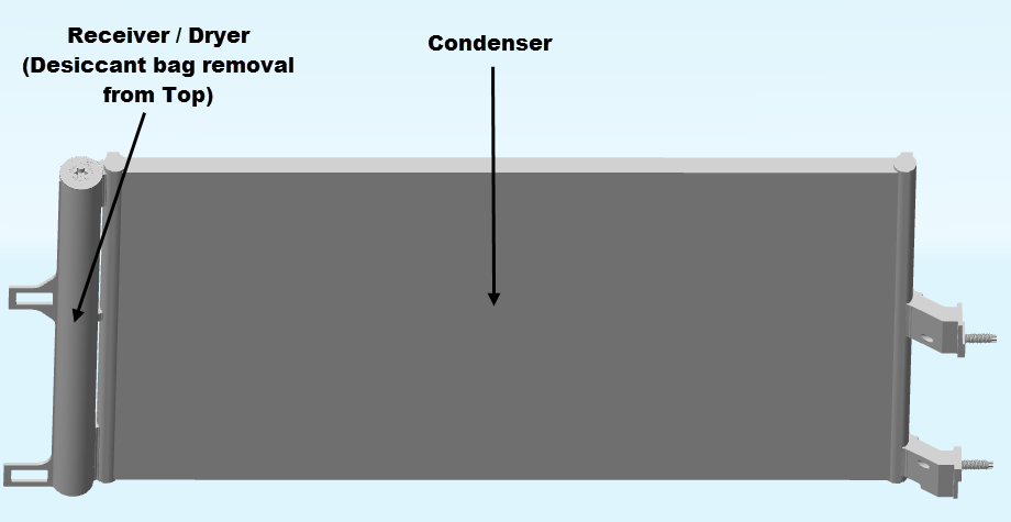 Without the receiver dryer, moisture in the A/C system may form ice in the TXV or EXV, restricting the flow of refrigerant in the system. The desiccant bag and the desiccant filter are housed in the receiver dryer located in the tank on the left end of the condenser. To simplify desiccant bag replacement, the desiccant bag and filter can be removed from the top of the vehicle.
