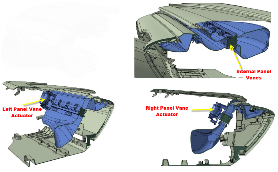 Driver and passenger side-to-side airflow adjustment is provided by panel vanes and actuators hidden inside the left side and the right side of the instrument panel.